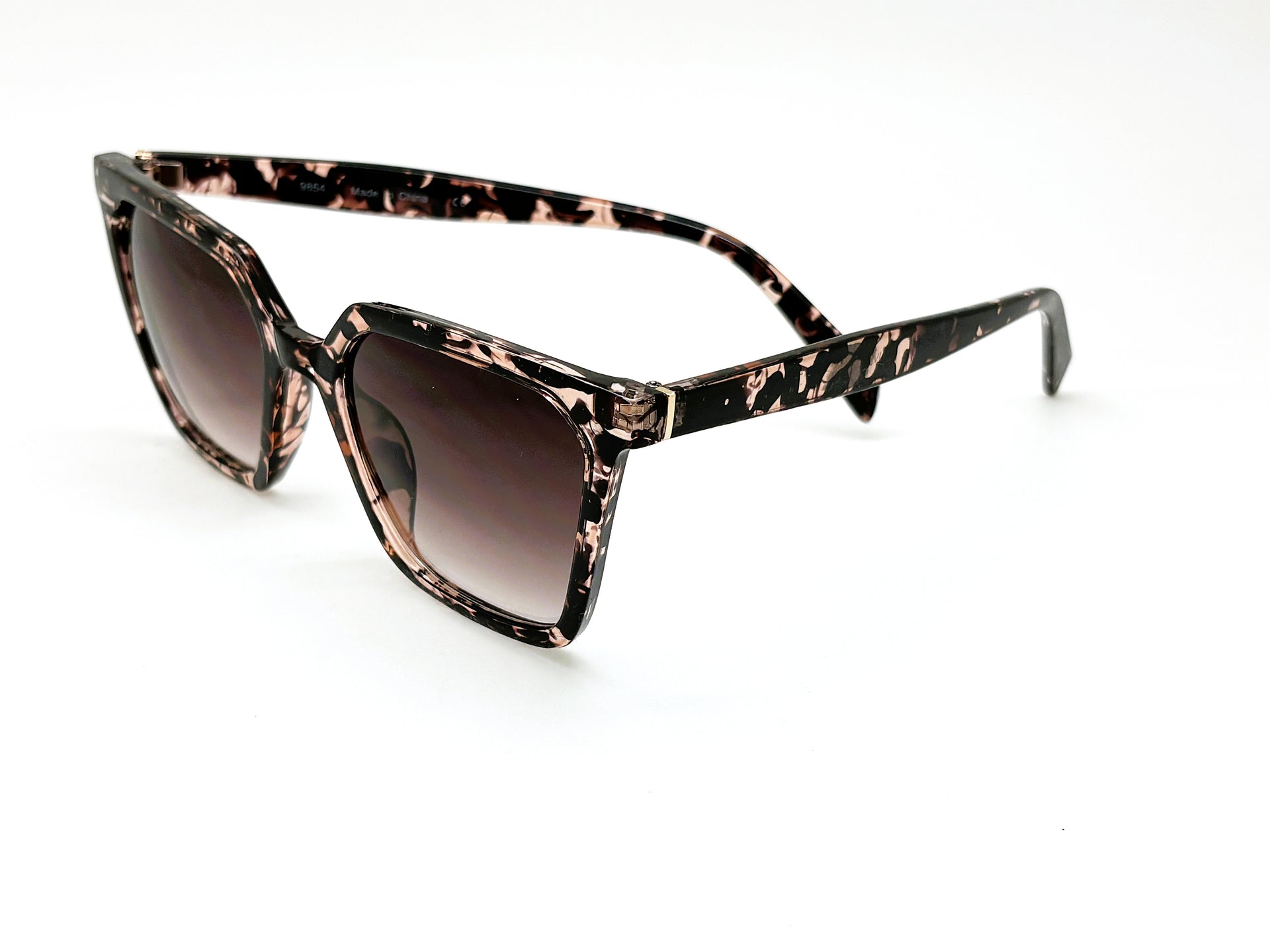 Penelope is a bold fashion statement with these stunning women's oversized square sunglasses by Desert Sunglass. The distinctive tortoiseshell pattern frame combines black and warm rose tones for a sophisticated, eye-catching look. Featuring an elegant cat-eye detail that adds a touch of vintage glamour, these sunglasses perfectly balance classic and contemporary style.
